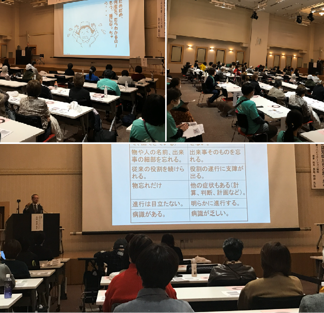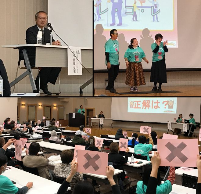認知症についてや予防等、〇×で答えるクイズ形式で参加を促し、物取られ等の症状について寸劇を取りいれ、実際に症状と共存するためのポイントを、第一部の講師に再度ご登壇頂き、より具体的に伝えて頂きました。特別講演では専門用語がなく解りやすかったというアンケート結果と共に、認知症=幸福になれるよう支援するという言葉が心に残りました。