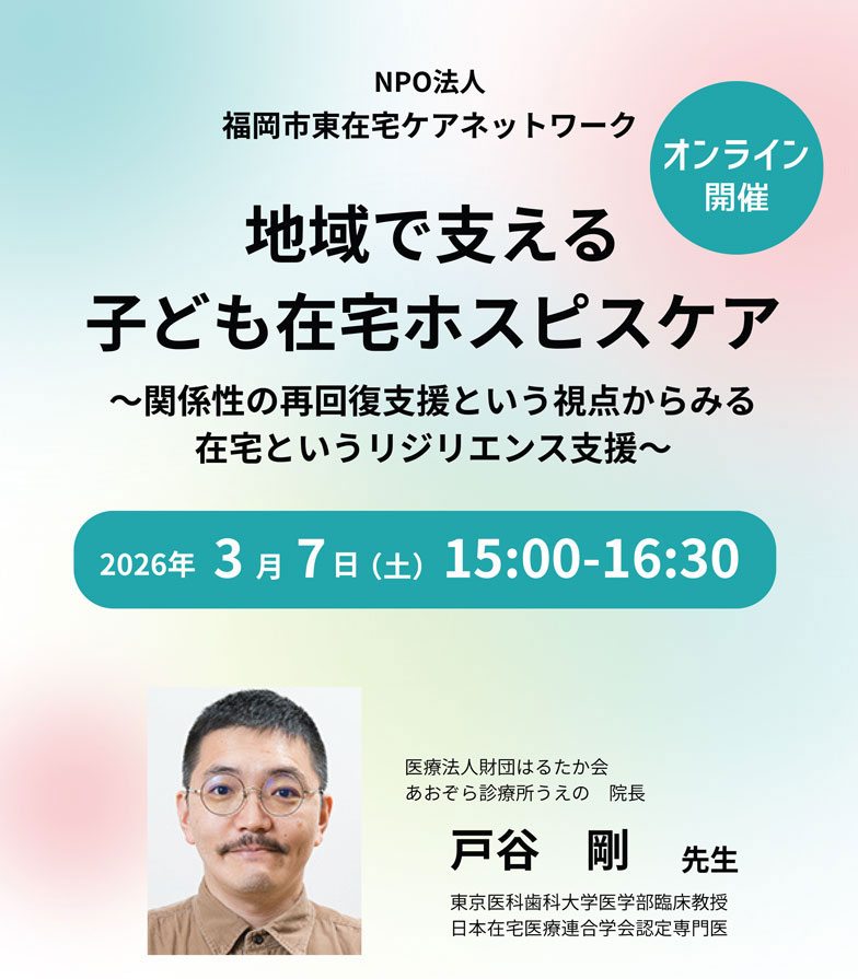 3月7日(土)多職種研修会がオンラインにて開催されました。講師は、医療法人財団はるたか会あおぞら診療所うえの 院長戸谷 剛先生。テーマ「地域で支える子ども在宅ホスピスケア~関係性の再回復支援という視点からみる在宅というリジリエンス支援~」。参加者は40名。